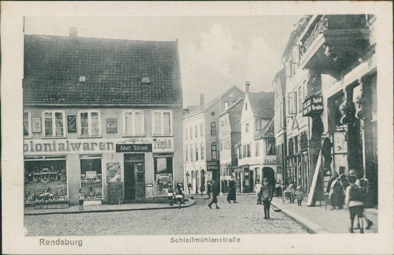 Schleifmühlenstraße mit Kolonialwarenhandlung von Albert Schramm