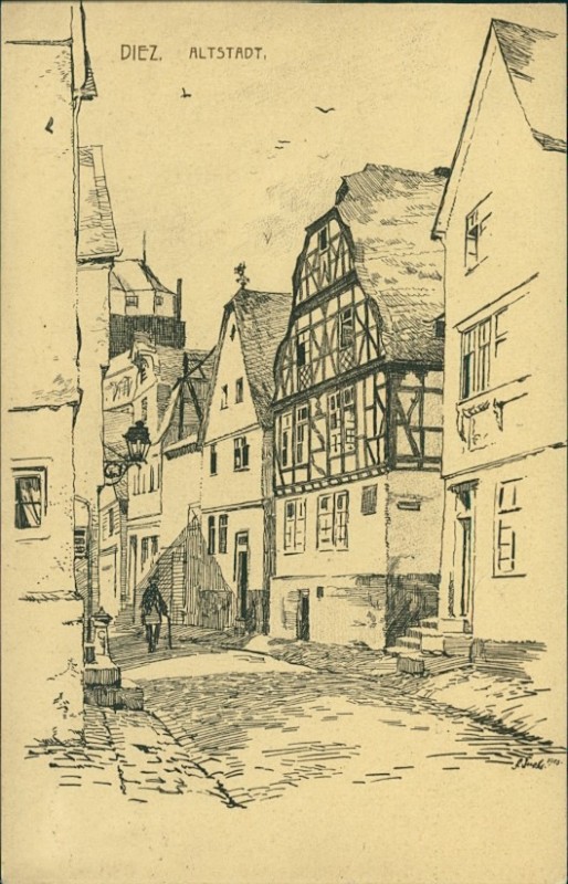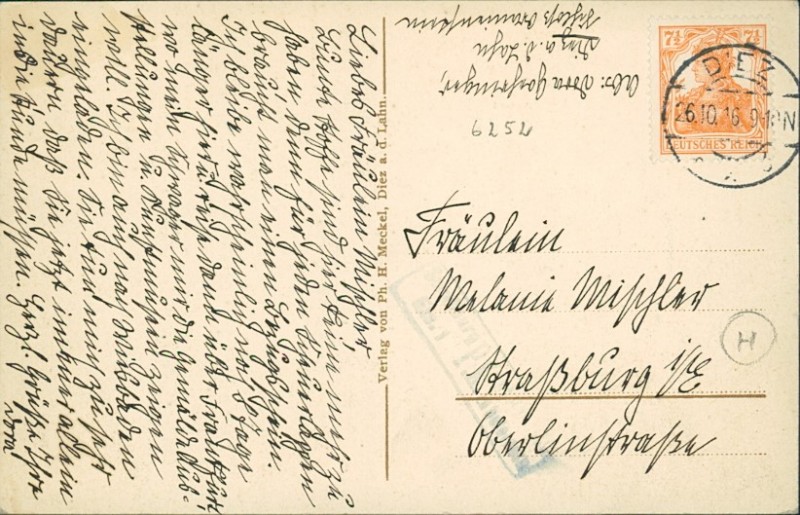 Alte Ansichtskarte aus Diez, gelaufen am 26.10.1916 von Diez nach Straßburg i/E.