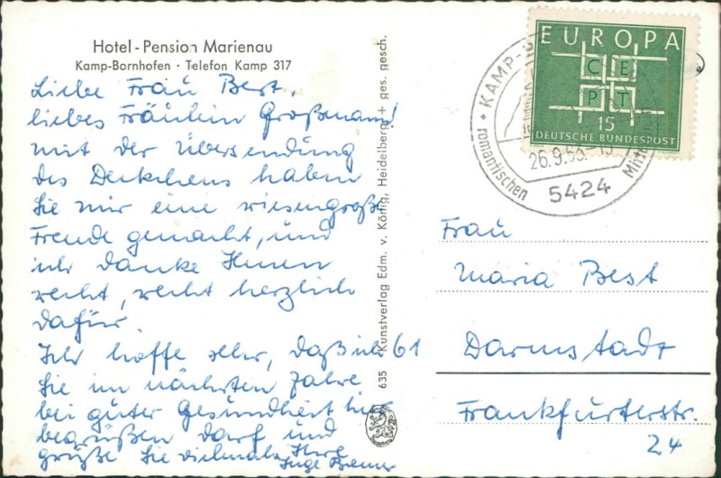 Alte Ansichtskarte aus Kamp-Bornhofen (Loreley), gelaufen am 26.09.1963 von Kamp-Bornhofen (Ortswerbestempel) nach Darmstadt.
