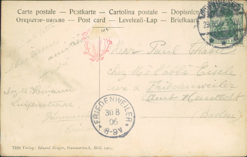 Alte Ansichtskarte aus Gummersbach, gelaufen am 29.08.1906 von Gummersbach nach Friedenweiler. Ankunft in Friedenweiler am 30.08.1906.