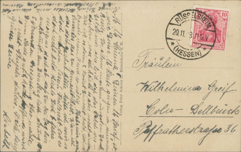 Alte Ansichtskarte aus Rüsselsheim am Main, gelaufen am 20.11.1913 von Rüsselsheim (Hessen) nach Cöln-Dellbrück.