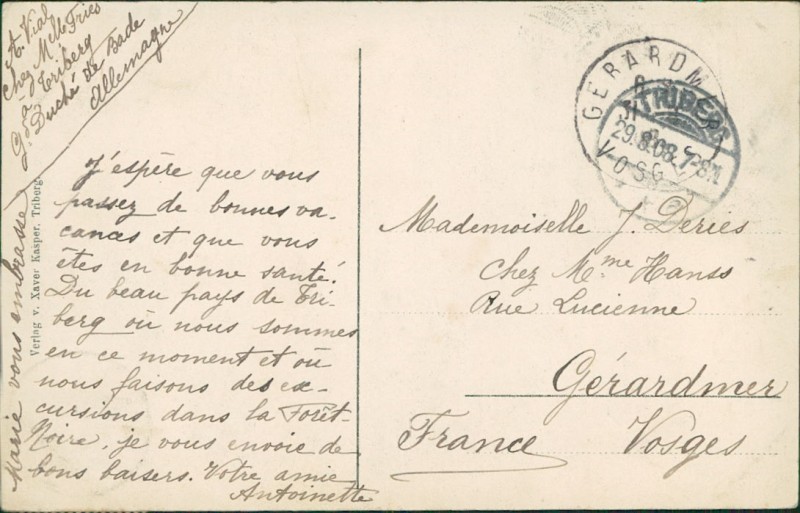 Alte Ansichtskarte aus Triberg im Schwarzwald, gelaufen am 29.08.1908 von Triberg nach Géradmer.