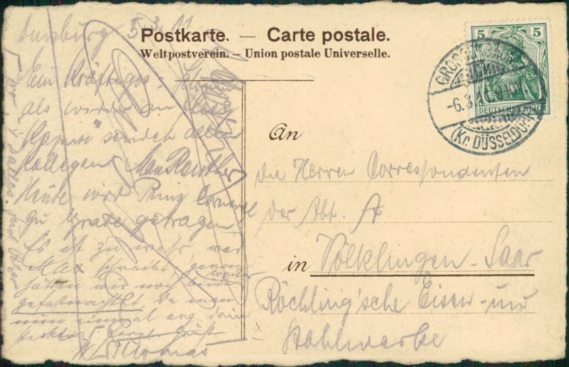 Alte Ansichtskarte aus Duisburg, gelaufen am 06.03.1911.