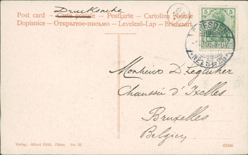 Alte Ansichtskarte aus Zittau, gelaufen am 01.12.1905 von Dresden nach Bruxelles.
