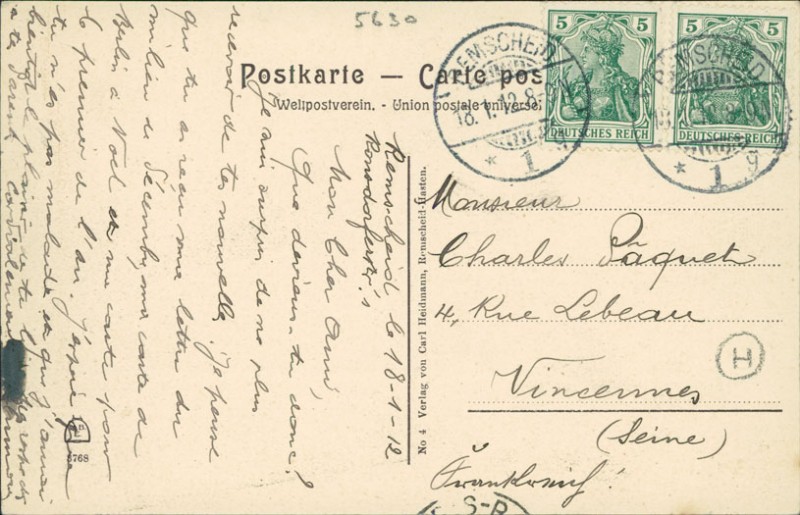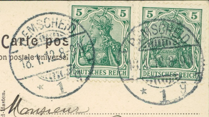 Alte Ansichtskarte aus Remscheid-Hasten, gelaufen am 18.01.1912 von Remscheid nach Vincennes.