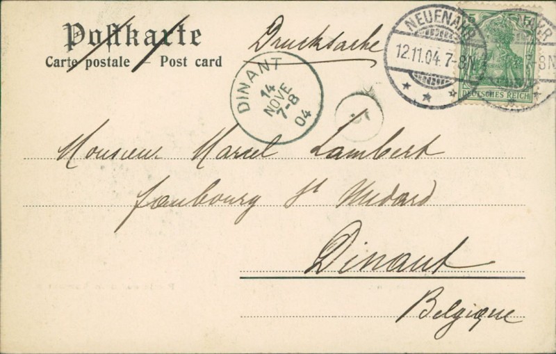 Alte Ansichtskarte aus Bad Neuenahr-Ahrweiler, gelaufen am 12.11.1904 von Neuenahr nach Dinant.