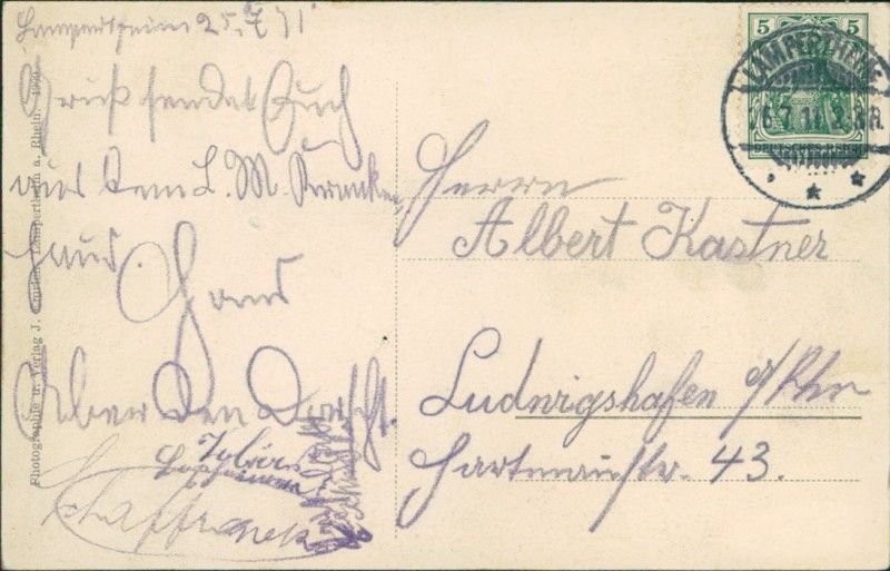 Alte Ansichtskarte aus Lampertheim, gelaufen am 26.07.1911 von Lampertheim nach Ludwigshafen a/Rh.
