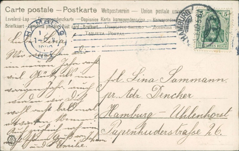 Alte Ansichtskarte, gelaufen am 01.01.1909 von Hamburg nach Hamburg-Uhlenhorst.