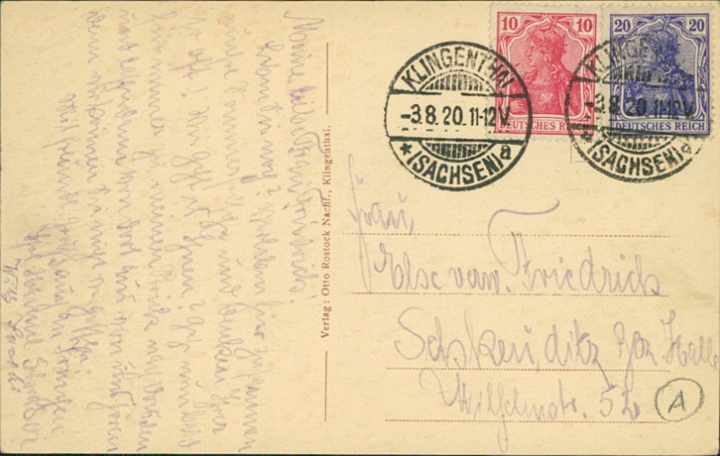 Alte Ansichtskarte aus Klingenthal, gelaufen am 03.08.1920 von Klingenthal (Sachsen) nach Schkeuditz.