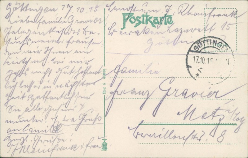 Alte Ansichtskarte aus Göttingen, gelaufen am 17.10.1915 von Göttingen nach Metz.