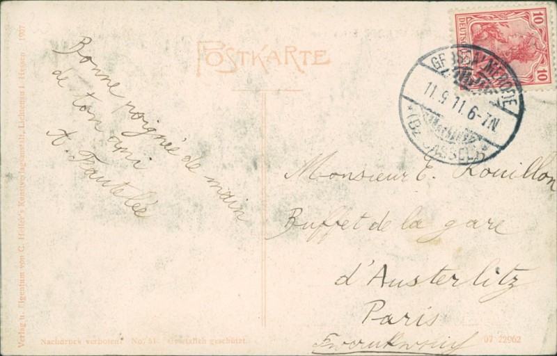 Alte Ansichtskarte aus Großalmerode, gelaufen am 11.09.1911 von Großalmerode nach Paris.