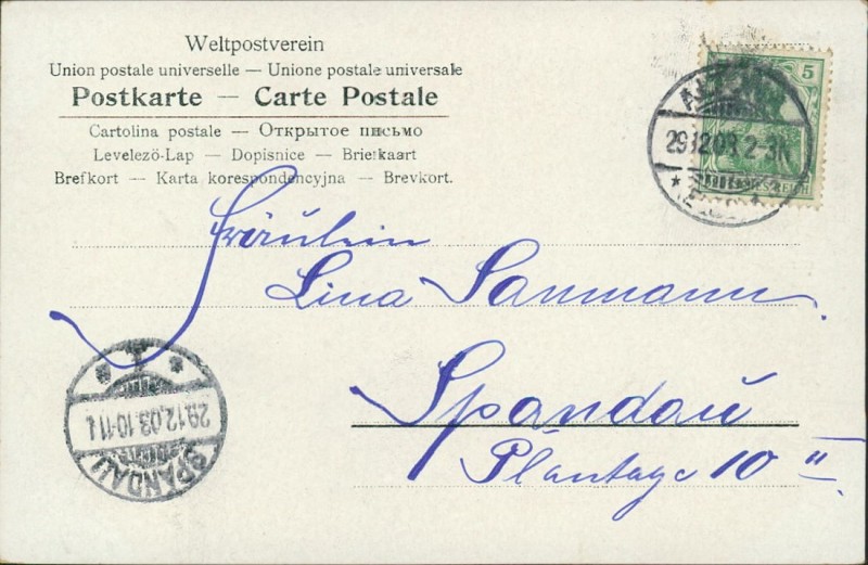 Alte Ansichtskarte, gelaufen am 29.12.1903 von Altona nach Spandau. Ankunft in Spandau am 29.12.1903.