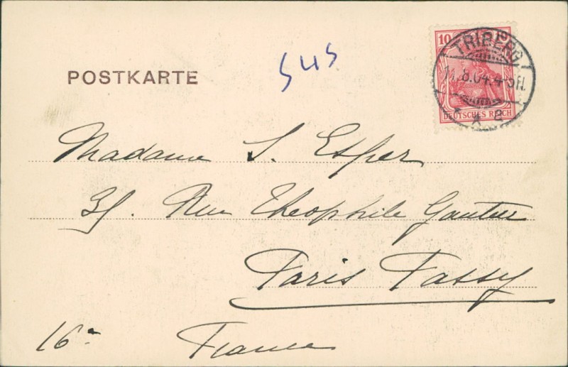 Alte Ansichtskarte aus Triberg im Schwarzwald, gelaufen am 11.08.1904 von Triberg nach Paris.