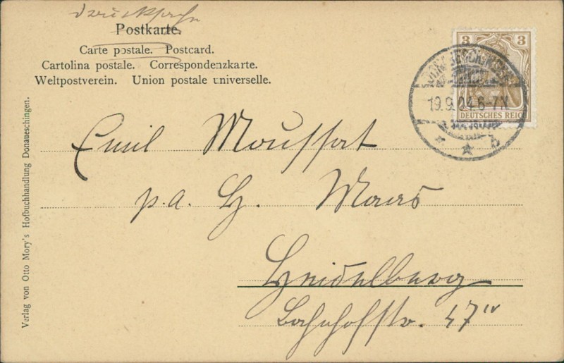 Alte Ansichtskarte aus Donaueschingen, gelaufen am 19.09.1904.