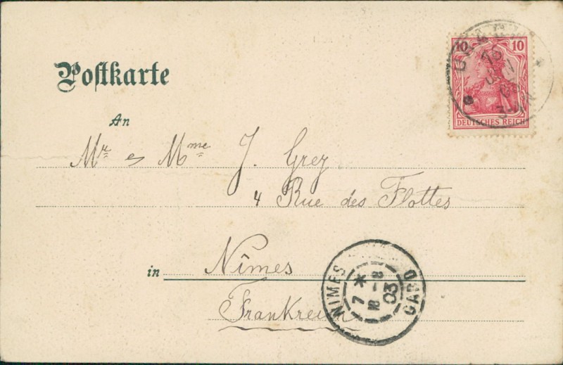 Alte Ansichtskarte aus Bad Urach, gelaufen am 16.06.1903 von Urach nach Nimes. Ankunft in Nimes am 18.06.1903.