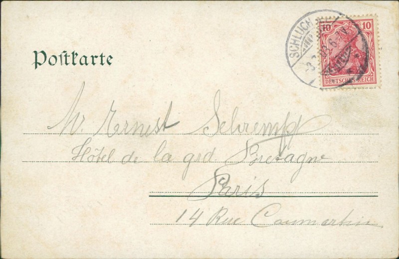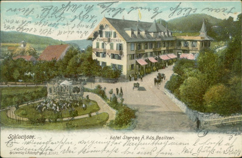 Alte Ansichtskarte aus Schluchsee, gelaufen am 03.07.1903 von Schluchsee nach Paris.