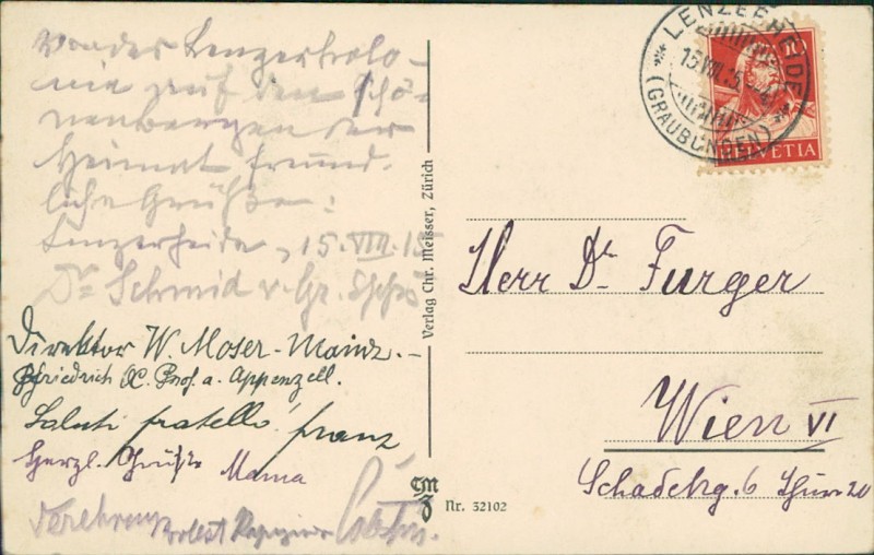 Alte Ansichtskarte aus Lenzerheide, gelaufen am 15.08.1915 von Lenzerheide (Graubünden) nach Wien.