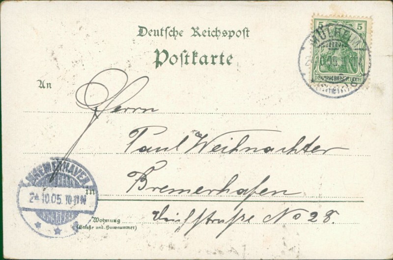 Alte Ansichtskarte aus Köln-Mülheim, gelaufen am 24.10.1905 von Mülheim (Rhein) nach Bremerhaven. Ankunft in Bremerhaven am 24.10.1905.