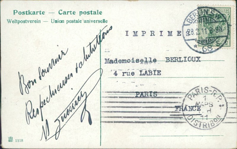 Alte Ansichtskarte aus Berlin-Schöneberg, gelaufen am 28.02.1911 von Berlin nach Paris. Ankunft in Paris am 01.03.1911.