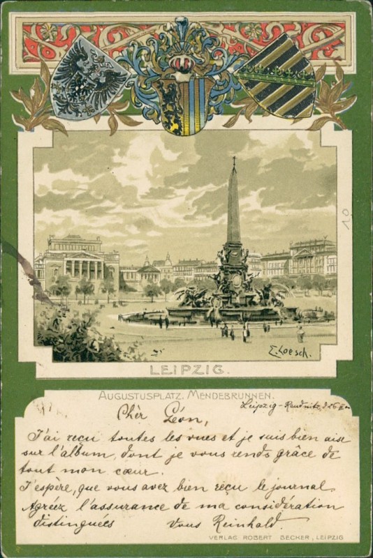 Alte Ansichtskarte aus Leipzig, gelaufen am 27.03.1900 von Leipzig nach Lyon.