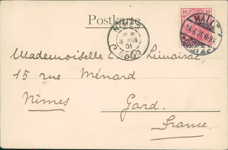Alte Ansichtskarte aus Halle (Saale), gelaufen am 14.06.1901 von Halle (Saale) nach Nimes. Ankunft in Nimes am 16.06.1901.