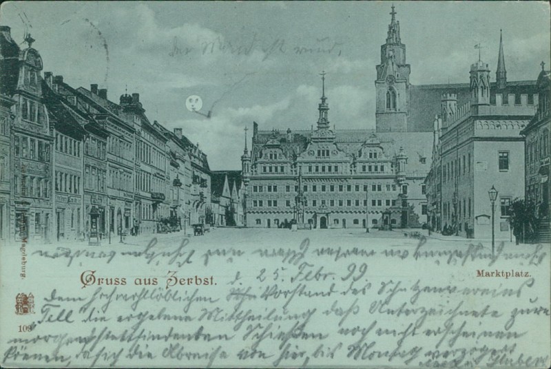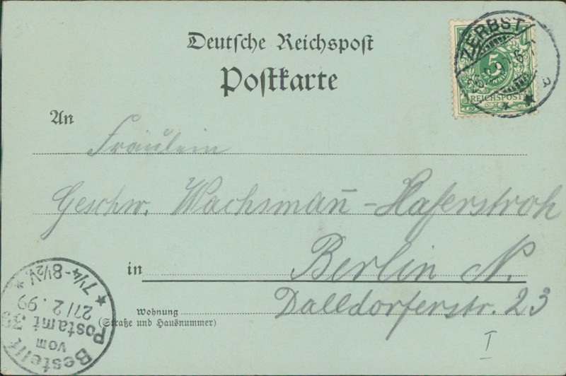 Alte Ansichtskarte aus Zerbst/Anhalt, gelaufen am 26.02.1899 von Zerbst nach Berlin. Ankunft in Berlin am 27.02.1899.