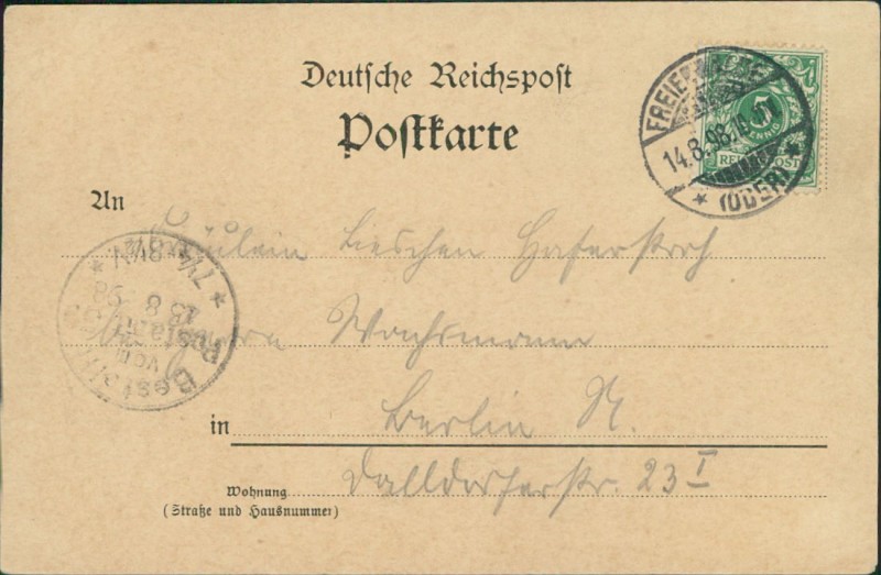 Alte Ansichtskarte aus Bad Freienwalde (Oder), gelaufen am 14.08.1898 von Freienwalde (Oder) nach Berlin. Ankunft in Berlin am 15.08.1898.