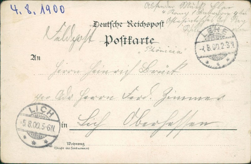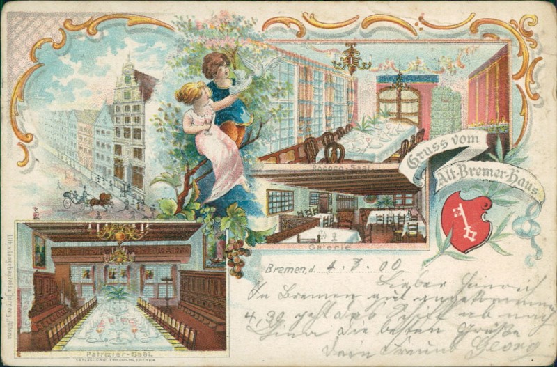 Alte Ansichtskarte aus Bremen, gelaufen am 04.08.1900 von Lehe nach Lich. Ankunft in Lich am 05.08.1900.