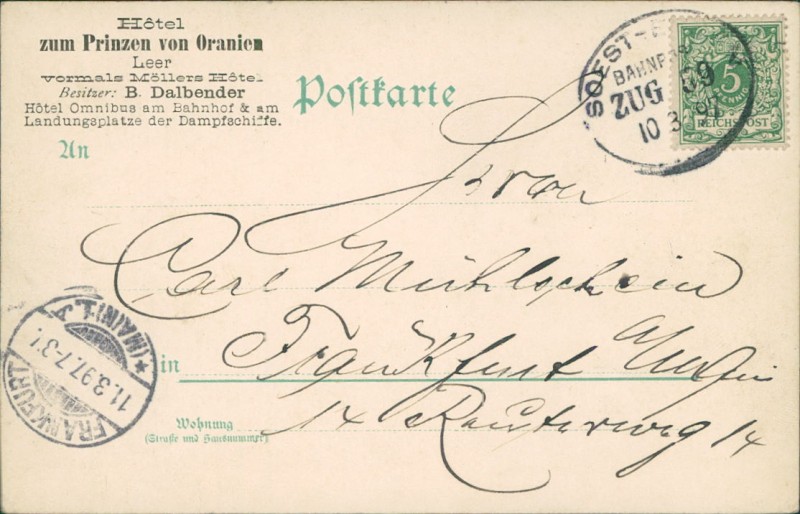 Alte Ansichtskarte aus Leer (Ostfriesland), gelaufen am 10.03.1897 von Soest-.. (Bahnpost) nach Frankfurt. Ankunft in Frankfurt am 11.03.1897.