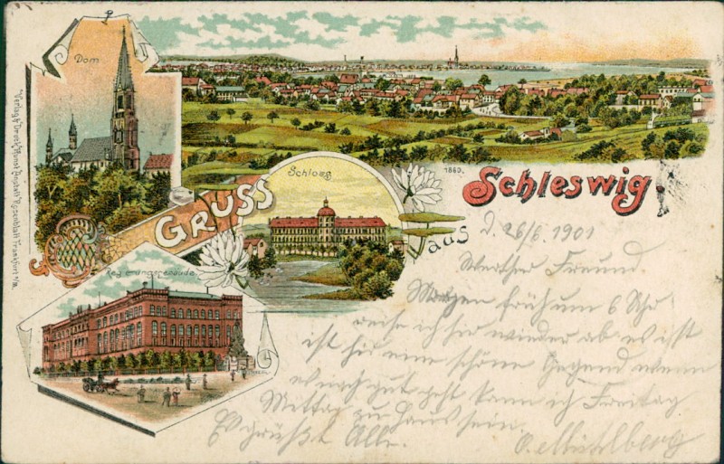 Alte Ansichtskarte aus Schleswig, gelaufen am 26.06.1901 von Schleswig nach Leipzig-Lindenau. Ankunft in Leipzig-Lindenau am 28.06.1901.