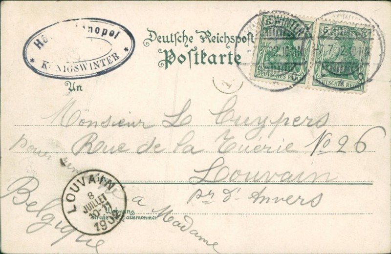 Alte Ansichtskarte, gelaufen am 07.07.1902 von Königswinter nach Louvain. Ankunft in Louvain am 08.07.1902.