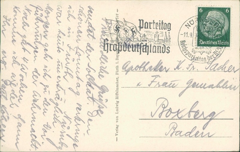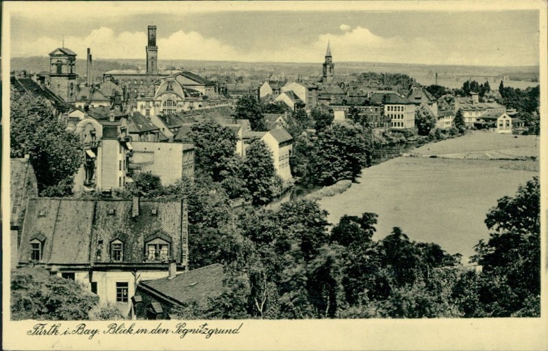 Alte Ansichtskarte aus Fürth, gelaufen am 11.09.1938 von Nürnberg nach Boxberg.