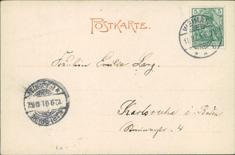 Alte Ansichtskarte aus Weimar, gelaufen am 11.09.1901 von Weimar nach Karlsruhe. Ankunft in Karlsruhe am 12.09.1901.