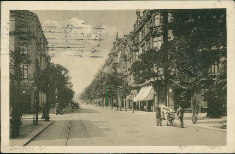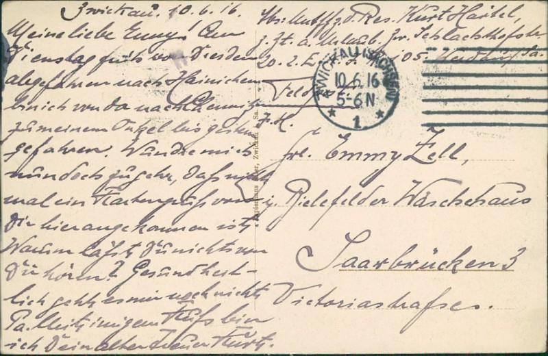 Alte Ansichtskarte aus Zwickau, gelaufen am 10.06.1916 von Zwickau (Sachsen) nach Saarbrücken.