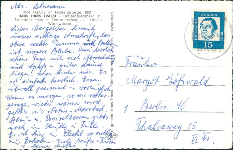 Alte Ansichtskarte aus Warmensteinach-Fleckl, gelaufen um 1964.