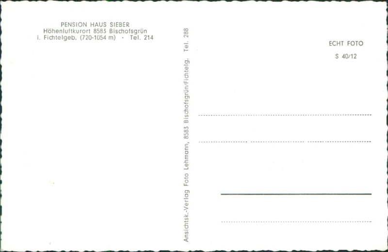 | Verlag | Ansichtsk.-Verlag Foto Lehmann, 8583 Bischofsgrün/Fichtelg. Tel. 288 |