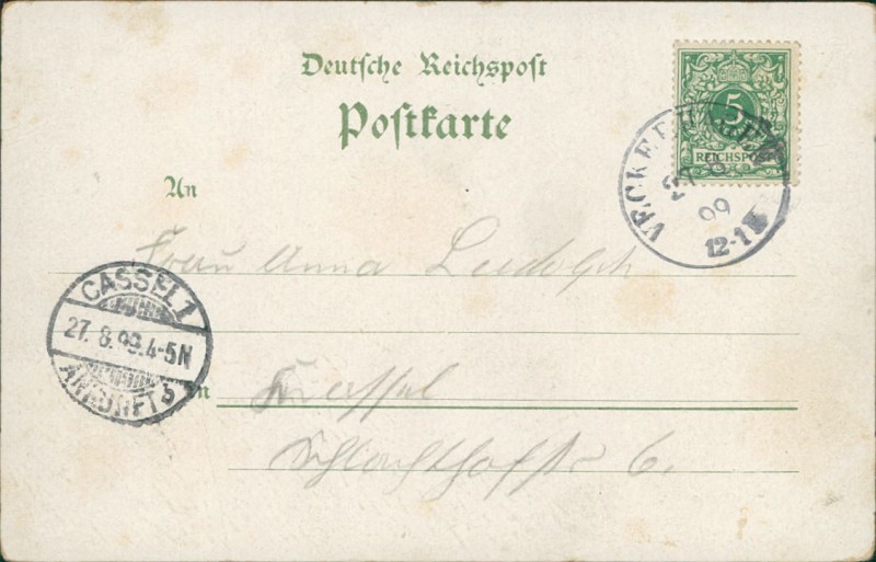 Alte Ansichtskarte aus Reinhardshagen, gelaufen am 27.08.1899 von Veckerhagen nach Cassel. Ankunft in Cassel am 27.08.1899.