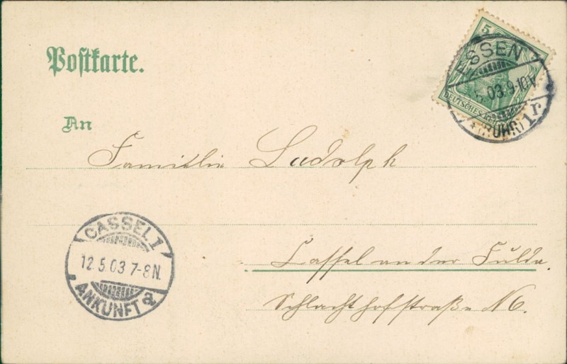 Alte Ansichtskarte aus Essen, gelaufen am 12.05.1903 von Essen (Ruhr) nach Cassel. Ankunft in Cassel am 12.05.1903.