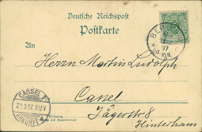 Alte Ansichtskarte aus Berlin, gelaufen am 21.03.1897 von Berlin nach Cassel. Ankunft in Cassel am 22.03.1897.