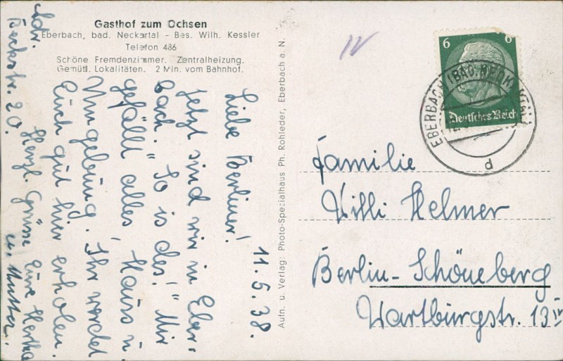Alte Ansichtskarte aus Eberbach, gelaufen am 12.05.1938.