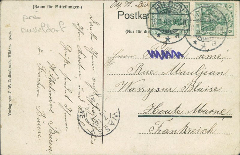 Alte Ansichtskarte aus Hilden, gelaufen am 16.01.1909.