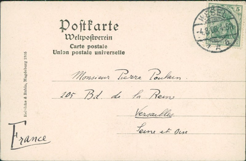 Alte Ansichtskarte aus Wesel, gelaufen am 04.08.1908 von Wesel nach Versailles.