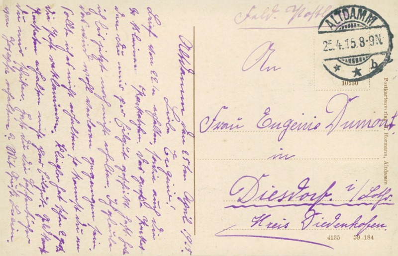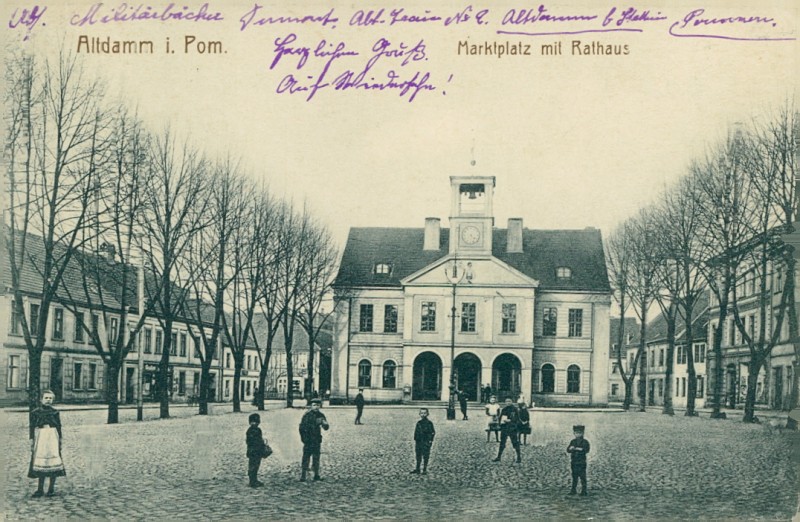 Alte Ansichtskarte aus Altdamm / Dąbie, gelaufen am 25.04.1915 von Altdamm nach Diesdorf i/Lothr.