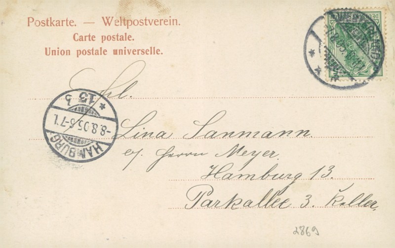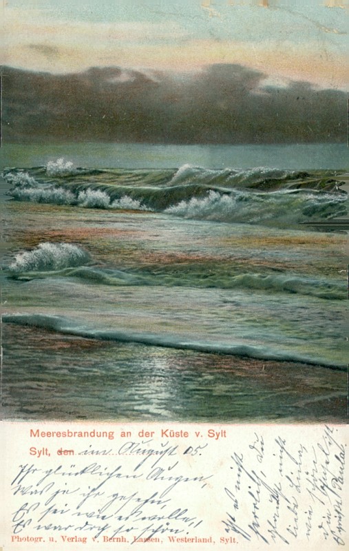 Alte Ansichtskarte aus Sylt, gelaufen am 07.08.1905 von Westerland nach Hamburg. Ankunft in Hamburg am 08.08.1905.
