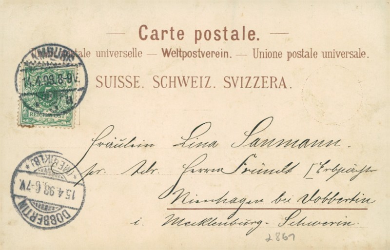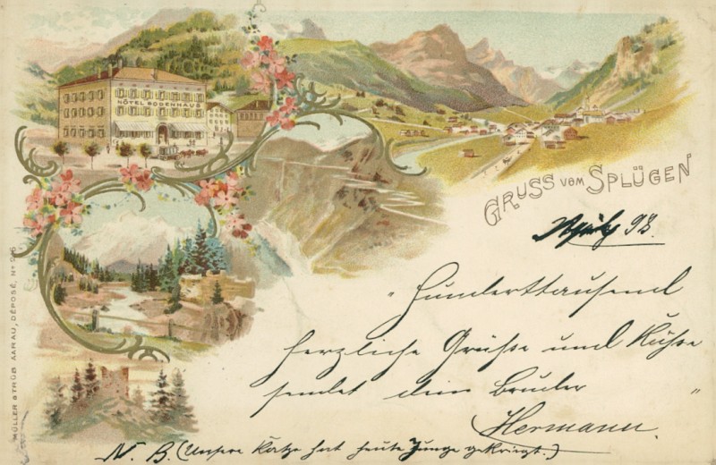 Alte Ansichtskarte aus Splügen, gelaufen am 14.04.1898 von Hamburg nach Dobbertin. Ankunft in Dobbertin am 15.04.1898.