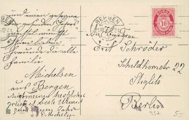 Alte Ansichtskarte, gelaufen am 21.12.1912 von Bergen nach Berlin.