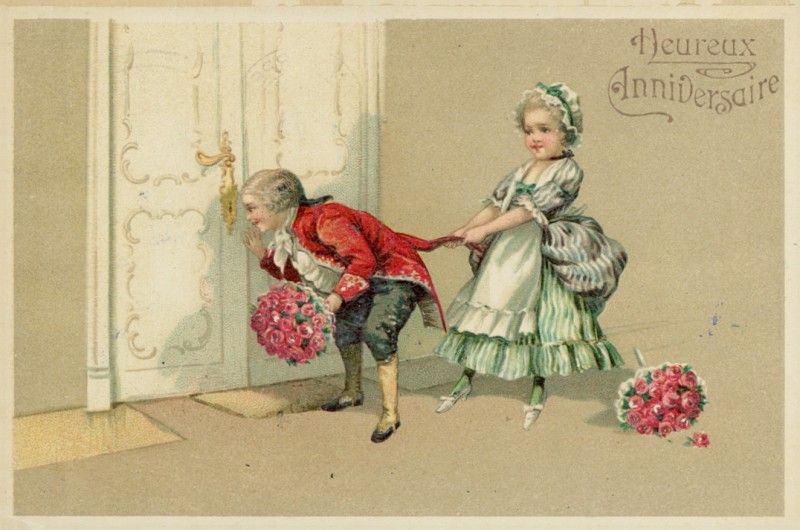 Kavalier mit Blumenstrauß schaut durch Schlüsselloch (Prägelitho)