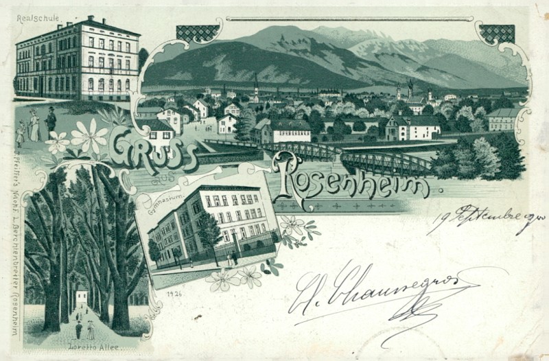 Alte Ansichtskarte aus Rosenheim, gelaufen am 18.09.1900 von Rosenheim nach Paris. Ankunft in Paris am 19.09.1900.