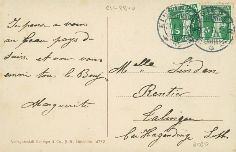 Alte Ansichtskarte aus Einsiedeln, gelaufen am 28.05.1914.