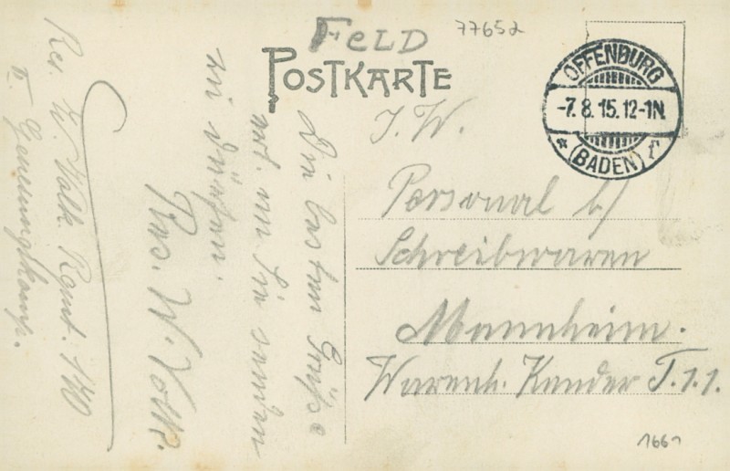 Alte Ansichtskarte aus Offenburg, gelaufen am 07.08.1915 von Offenburg nach Mannheim.